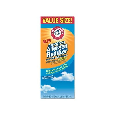 Give carpeted rooms a fresh, clean smell with this box of deodorizing and allergen reducing powder. This shaker box contains deeply penetrating baking soda to eliminate odors at their source and disrupt the static charge that keeps allergens bound to carpet fibers, making it easy to vacuum messes and pollen away. Incorporate this Arm & Hammer deodorizer and allergen reducer into a regular cleaning routine to help keep high-traffic carpets clean.